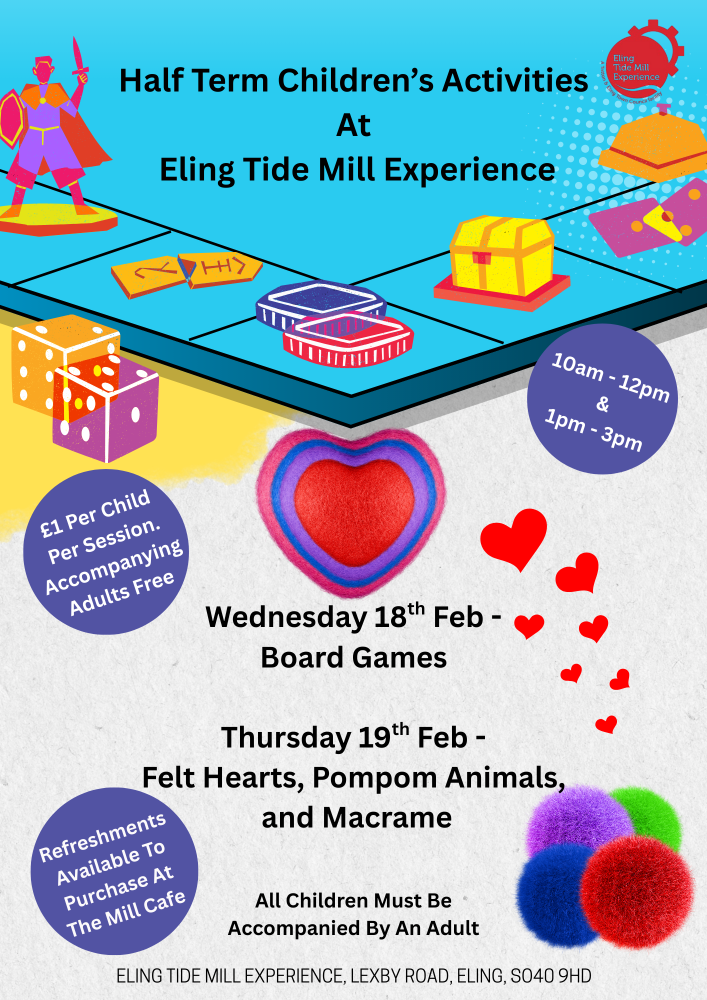 Looking for fun activities to take part in this half term? Head to Eling Tide Mill Experience for board games and craft activities.